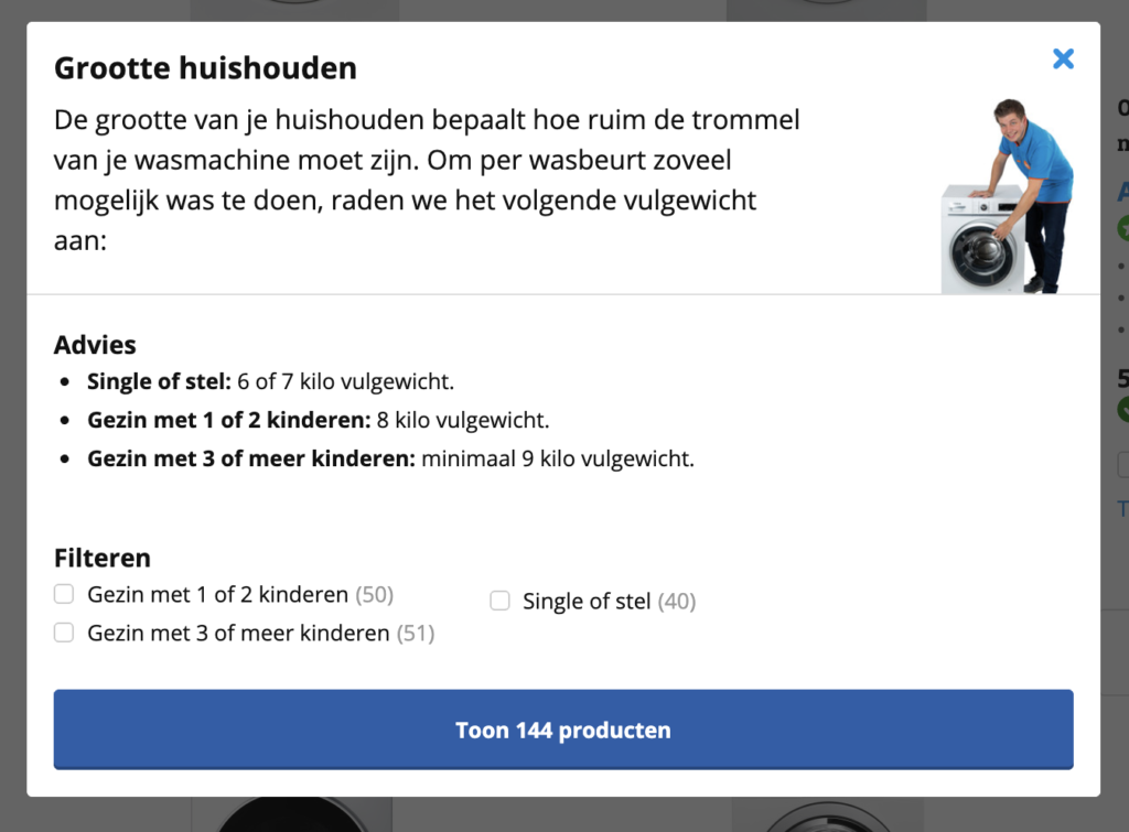 Okee, maar wacht even. Een eindklant een brandklep verkopen?! Dat kan toch niet! Die heeft daar helemaal geen verstand van… toch? Maar dan zul je toch écht even anders moeten gaan denken. Net zoals jij vroeger geen idee had waar je nou precies op moest letten bij de aanschaf van een wasmachine, vink je nu eenvoudig bij Coolblue aan welke selecties belangrijk zijn op basis van jouw behoefte. En de selectiecriteria worden ook nog eens steeds specifieker gebaseerd op jouw behoefte.